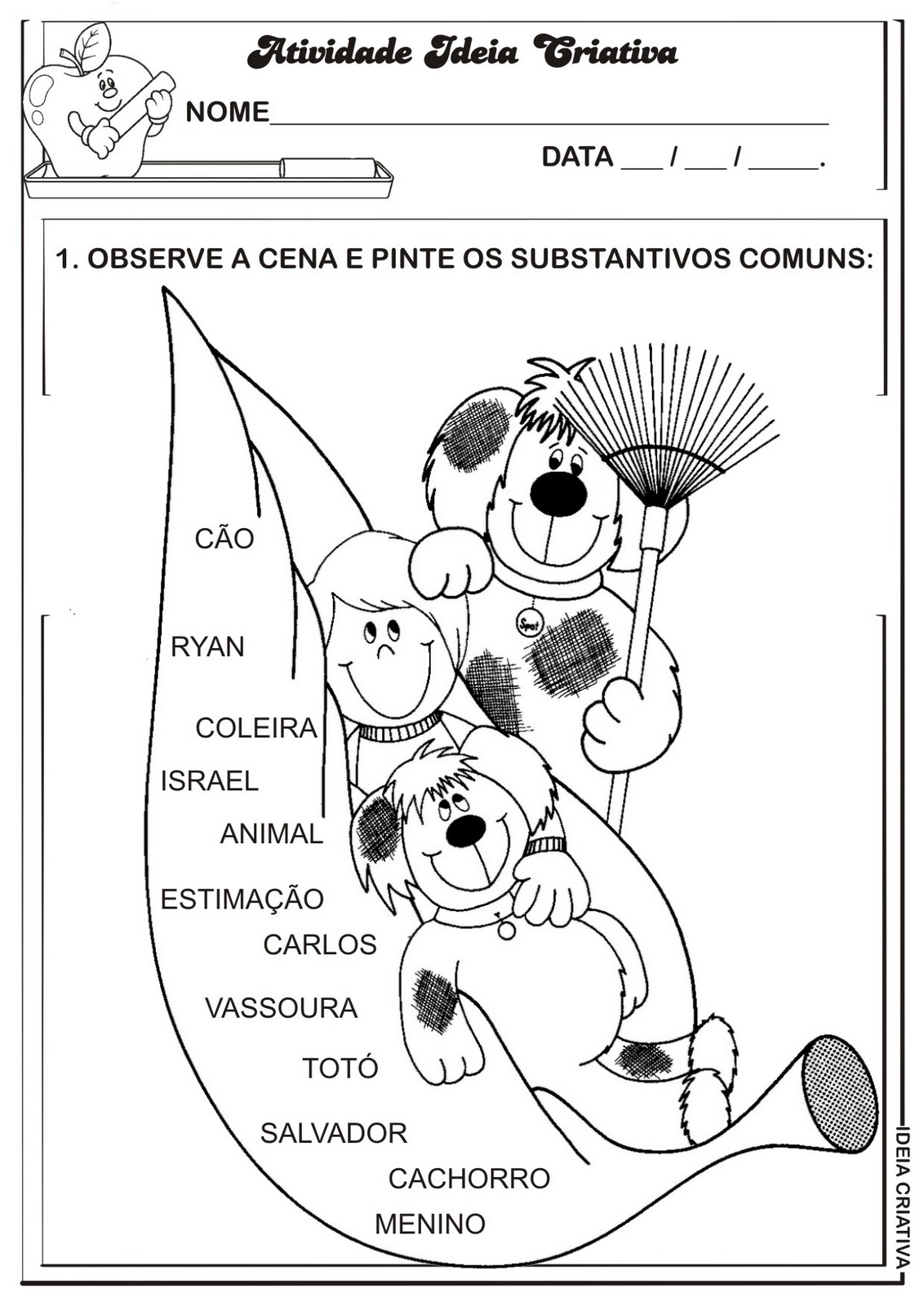 Brasil, ricardo, recife, carolina, totó. Colégio, bola, cachorro, navio, abelha. Atividades de português 3° ano. Atividades variadas de português para 3º ano do ensino fundamental. 3 ano substantivos comum e proprio.
