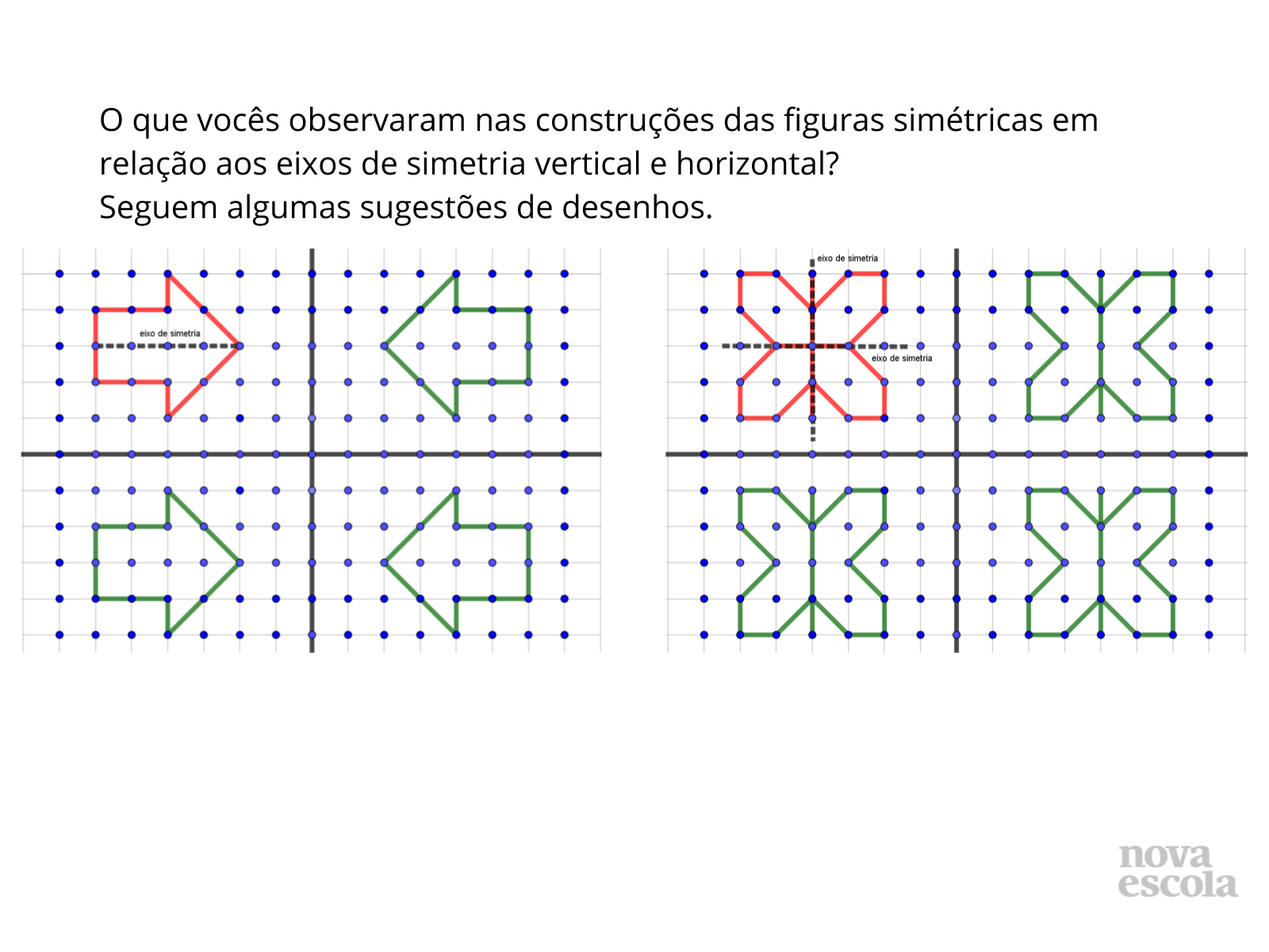 Identificação de figuras simétricas. Identifique o eixo de simetria. Desenhe eixos de simetria e figuras. Retomar a ideia de eixo de simetria: Os eixos de simetria dividem as figuras em duas partes simétricas, isto é, como se fosse o objeto e sua.