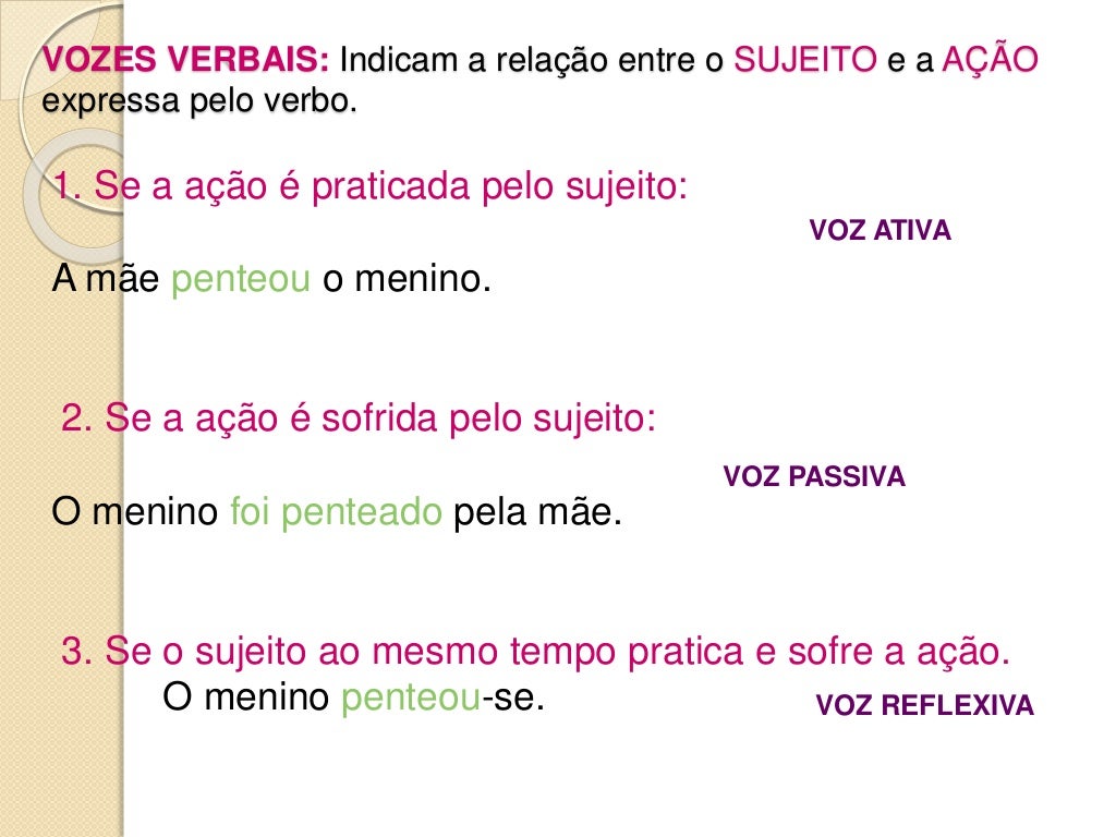 Continue lendo para entender como ela funciona e as outras duas também. As vozes verbais informam a relação entre a coisa referida e os participantes daquilo que é relatado. O que são vozes verbais? O verbo faz diversas flexões na língua portuguesa, como gênero, número, tempo e voz. Ele se flexiona para indicar quem pratica e quem.