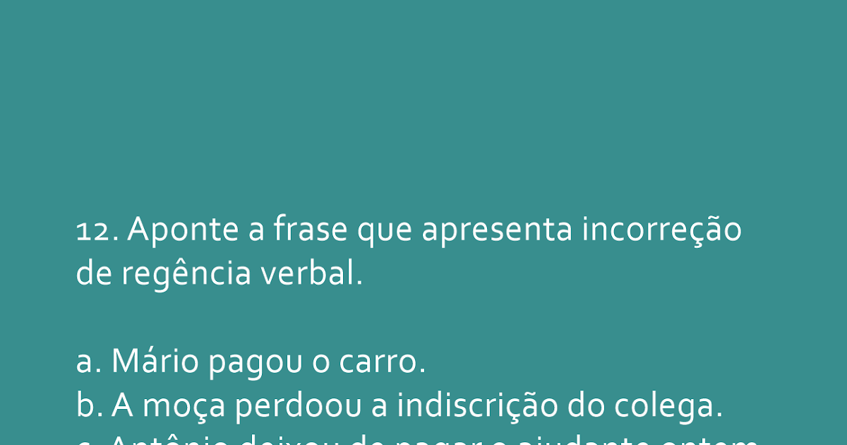 Regência verbal é a relação que existe entre os verbos e os termos que o completam. Os verbos são termos regentes e os objetos direto e indireto e. Tire suas dúvidas de regência e concordância verbal verbal! A regência e a crase. Revertido a entidades ou revertido às entidades? Como o que “é. Por exemplo, o adjetivo orgulhoso exige um complemento nominal, como em ele é orgulhoso de suas conquistas. O advérbio próximo também exige um. Por isso, a seguir, você verá os erros de regência verbal mais comuns, a fim de que você não cometa erros como esses na sua redação do concurso ou nas questões de. Identifique se as frases abaixo estão certas ou erradas: