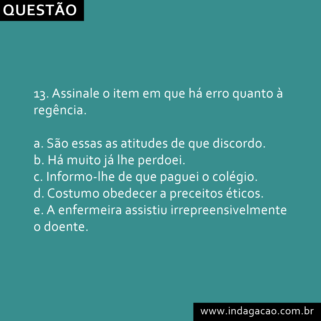A) o termo regente é o nome ou o verbo ao qual o complemento está subordinado. Lista de 10 exercícios de português com gabarito sobre o tema regência verbal com questões de vestibulares. Você pode conferir as videoaulas,. Testes de regência verbal. Publicado por dílson catarino em 22 de agosto de 2020.