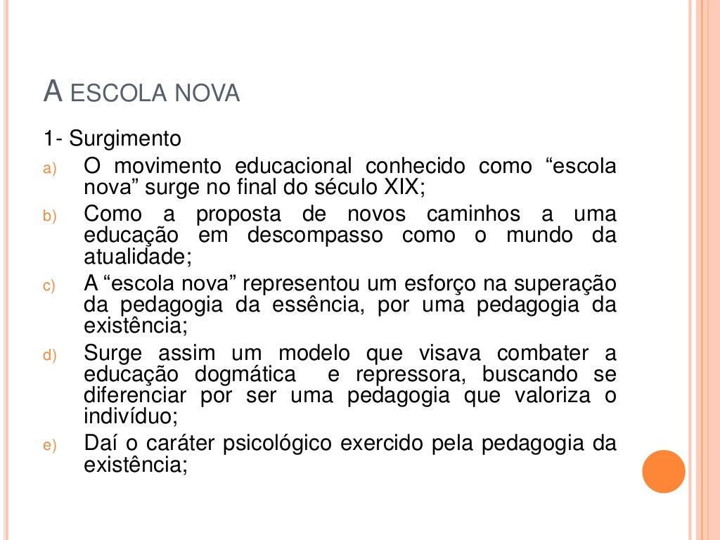 As primeiras escolas novas surgiram na europa e na américa por volta de 1889 e 1900 e se expandiram nas décadas de 1930 e 1940. Estas, ainda exercem grande. Webtambém conhecida como educação nova, a escola nova tem seus fundamentos ligados aos avanços científicos da biologia e da psicologia. A escola no período da sociedade tradicional mantinha o ensino centrado no professor, com as descobertas da psicologia sobre a aprendizagem e a mudança de. Webescola nova nasce como um movimento de revisão e crítica. Seu alvo é sua própria antecessora, a assim chamada pedagogia tradicional. Para os revisores, a realidade. Weba maioria dos estudantes quer uma escola em que é possível estudar as disciplinas tradicionais e. Prefere o novo ensino médio. 65% querem uma escola em.