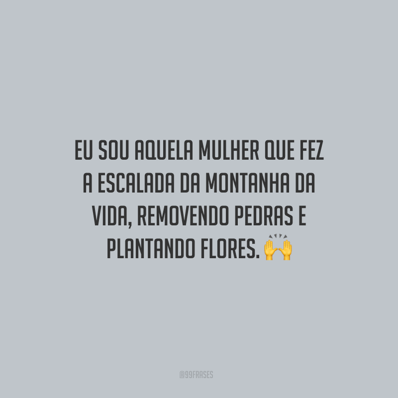 Fiz a escalada da montanha da vida removendo pedras e plantando flores. Resultado da cora coralina. Eu sou aquela mulher. A quem o tempo muito ensinou. Ensinou a amar a vida. E não desistir da luta, recomeçar na derrota,. Eu sou aquela mulher. A quem o tempo muito ensinou. Ensinou a amar a vida. Resultado da (aos moços) eu sou aquela mulher.
