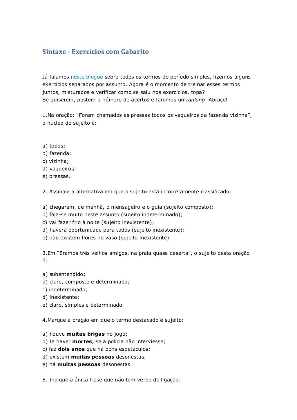 Fazer exercícios nunca é demais. Por isso, hoje disponibilizo mais 1 0 exercícios de sintaxe com gabarito. Algumas questões tratam dos termos das orações. Teste os seus conhecimentos sobre figuras de sintaxe, também chamadas de figuras de construção, fazendo os exercícios abaixo. Confira as respostas e tire as suas dúvidas. 1 questão 8505 | português, sintaxe, ensino médio. Assinale a alternativa em que o sujeito está incorretamente classificado: Lista de questões de vestibulares e concursos sobre sintaxe da língua portuguesa. (ufmg) indique a alternativa em que a função não. Teste seus conhecimentos sobre a função sintática dos termos, o tipo de sujeito e a espécie de oração com questões resolvidas de sintaxe.