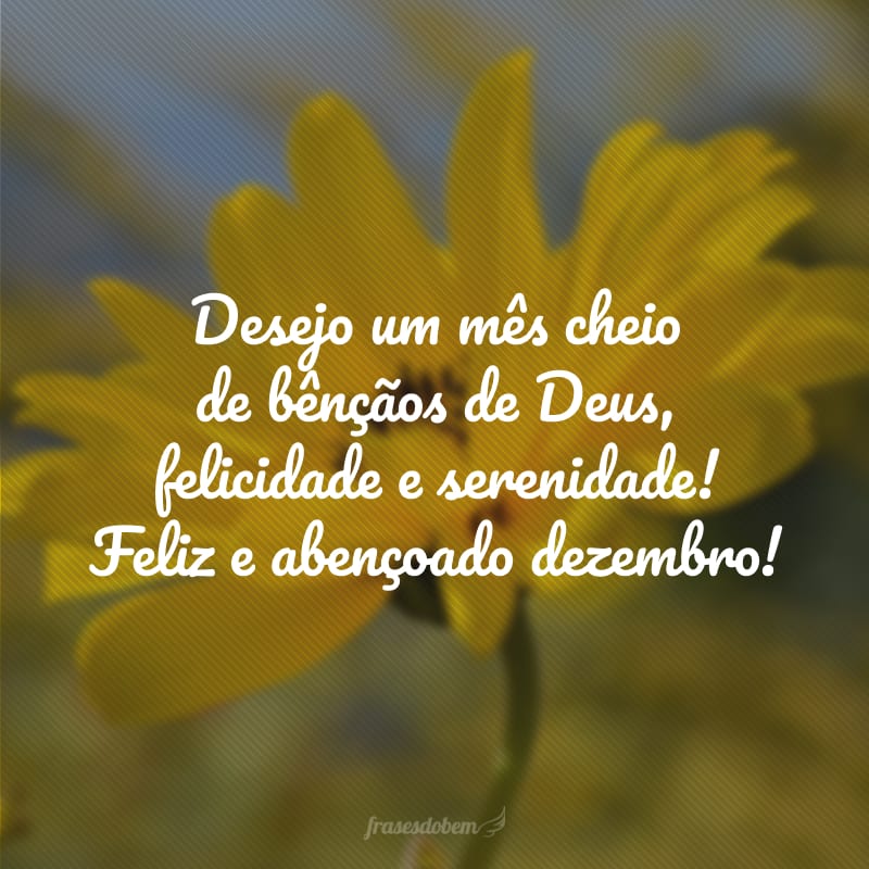 Estas frases são perfeitas para quem ama este mês e quer expressar seu amor e alegria. Grande é o nosso deus, que está conosco sempre. Cantarei a sua grandeza, ó meu deus e meu rei! Louvarei o seu nome durante toda a minha vida. Último mês do ano. Obrigado senhor por essa vitória! Que dezembro se inicie e também termine com muita alegria. Transforme o dezembro em um mês de alegria, gratidão e bondade. Curta cada minuto deste dezembro à medida que ele passa. Brilhe na luz das celebrações deste mês de.