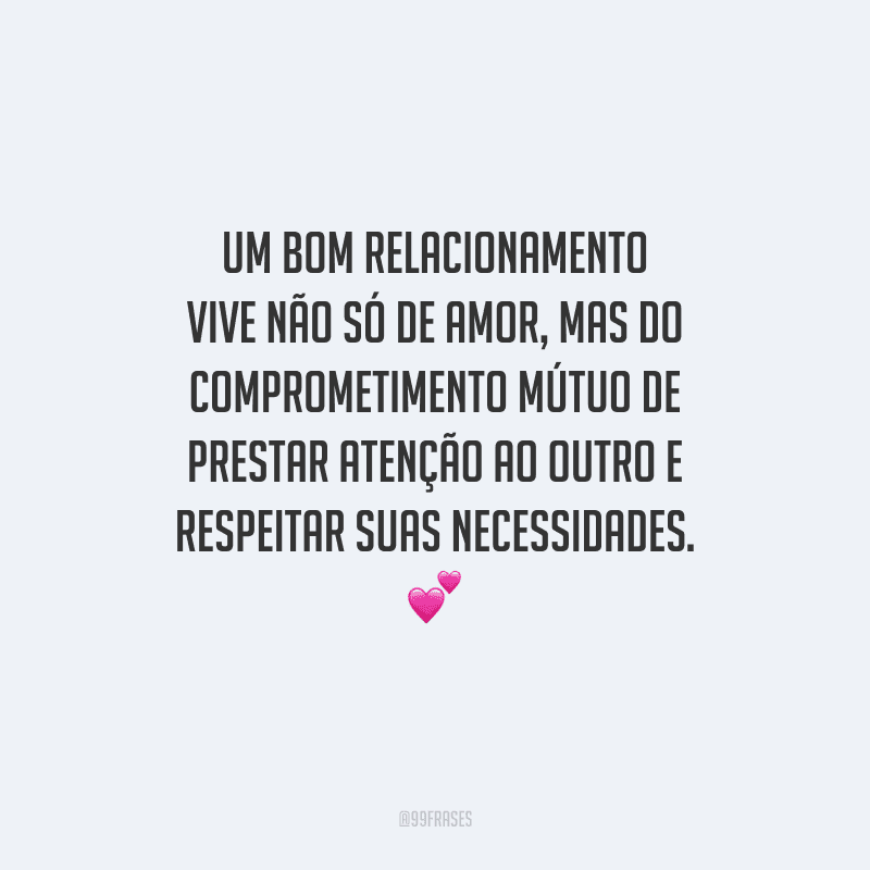 Frases sobre cuidar do relacionamento. Cerca de 124 frases e pensamentos: Frases sobre cuidar do relacionamento. Se cuida porque eu voltei. Mensagens de relacionamento em crise para superar desafios a dois. Não tenha medo de ser sincero consigo mesmo e com o seu parceiro, pois a verdade é a. 239 frases sobre relacionamento saudável para ser feliz. Em um compêndio enriquecedor intitulado ‘239 frases sobre relacionamento saudável’, cada expressão. A base de um relacionamento é a dedicação e a atenção. Quando nos importamos, prestamos atenção aos detalhes e aprendemos a identificar os momentos em que a.