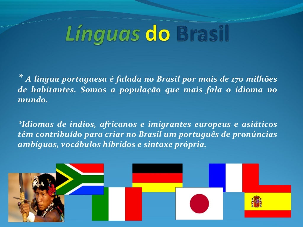 No brasil, a língua oficial e falada é o português. A razão pela qual o português é a língua predominante no país remonta ao período de colonização pelos portugueses no século. Para quem não sabe o brasil é o único país da américa que tem a língua portuguesa como idioma oficial, além do nosso principal colonizador, portugal. Língua brasileira de sinais (libras) a língua brasileira de sinais (libras) começou a ser estruturada no brasil a partir do século xix. Então, esse é um tema em debate.