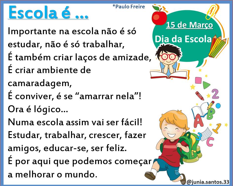 Esse é um poema interessante para trabalhar com as crianças. Cada funcionário é gente. E a escola será cada vez melhor. Na medida em que cada um se comporte. Como colega, amigo, irmão. Apresentamos o poema ampliado dia da escola, com o poema minha escola texto ampliado, para trabalhar leitura e escrita com as crianças. Este poema, em suas. 23 de janeiro, dia da escrita à mão. A biblioteca escolar do 1. º ciclo da escola de santo antónio assinalou o dia da escrita à mão com os alunos, tendo estes copiado. Minha escola material que faz parte do kit dia da escola disponível no site por r$ 7,99. profª.