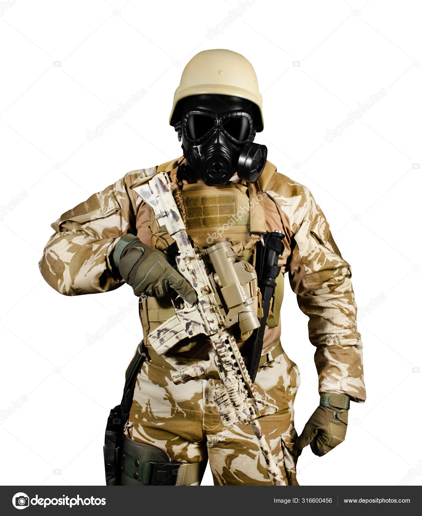 Soldado isolado em uniforme e máscara de gás de pé com rifle . fotos