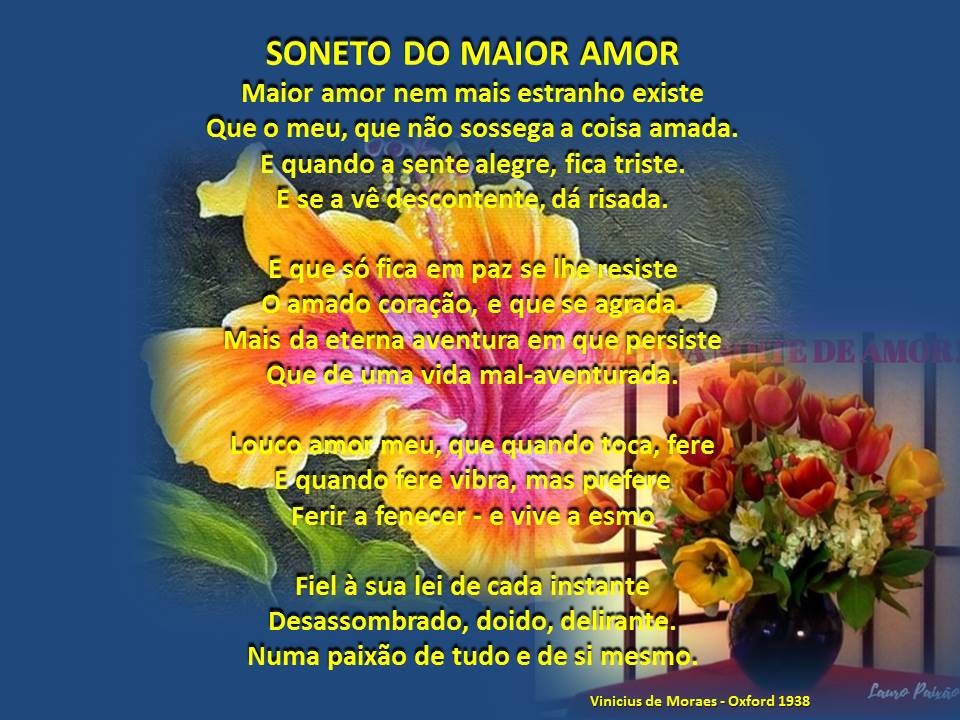 E quando a sente alegre,. Websoneto do maior amor. Maior amor nem mais estranho existe. Que o meu, que não sossega a coisa amada. E quando a sente alegre,. Websoneto do maior amor. Maior amor nem mais estranho existe. Que o meu, que não sossega a coisa amada. E quando a sente alegre, fica triste. E se a vê descontente, dá.